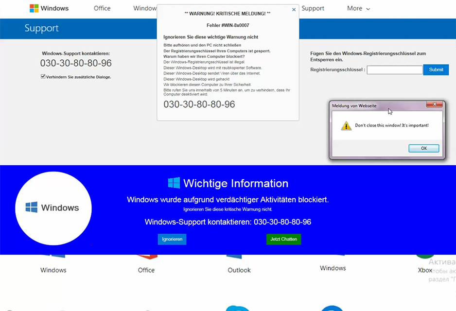 Pop-up-Fehlermeldungen sind Einblendungen auf Ihrem Computer (sog. Pop-up-Fenster), die täuschend echt Viren- oder Softwareprobleme vorgeben. So lassen sich zum Beispiel offene Anwendungen auf dem PC nicht mehr schließen. Häufig ertönt dabei auch ein akustisches Signal oder eine Sprachnachricht, was Sie zusätzlich verunsichern soll. Angeblich kostenlose Hilfe verspricht Ihnen in diesem Moment eine eingeblendete Telefonnummer.