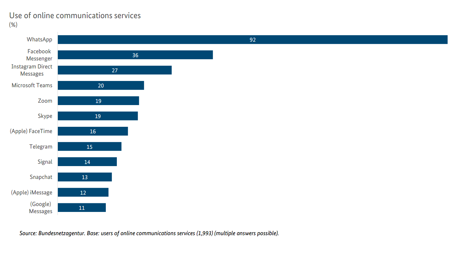 The most frequently used online communications services in Germany have the following percentages of use: WhatsApp 92% (2021: 93%), Facebook Messenger 36% (2019: 39%), Instagram Direct Messages 27% (2019: 25%), Microsoft Teams 20% (2021: 14%) and Zoom 19% (2021: 18%).