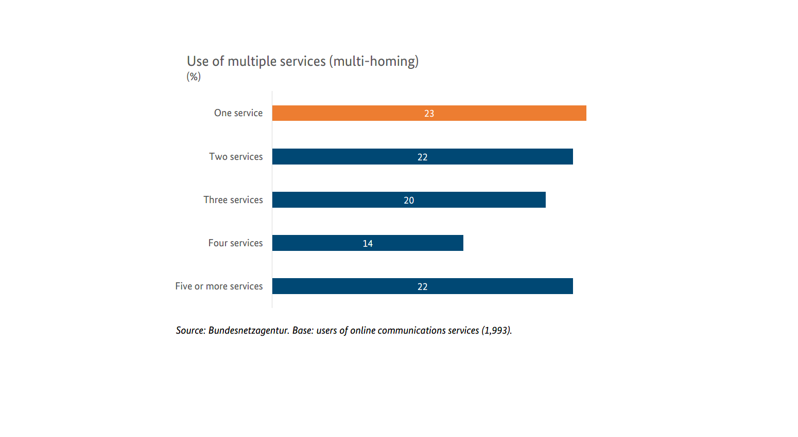 More than three quarters (77%) of the users of online communications services use at least two different services in parallel and therefore practise what is known as multi-homing. This represents an increase of 12 percentage points compared with the 2019 survey. More than one third (36%) of all users use as many as four or more services in parallel. On average, each user uses 3.2 different online communications services.