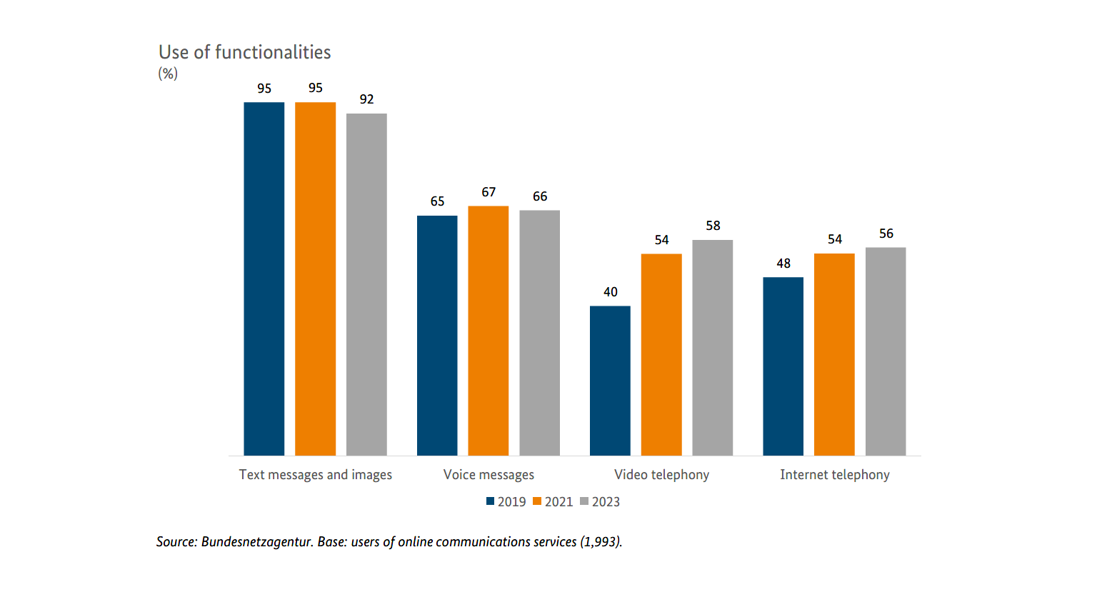 The most frequently used functionalities are sending and receiving text messages and images, and sending and receiving voice messages. 92% of users send and/or receive text messages and images while 66% send and/or receive voice messages. The use of video and internet telephony functionalities is increasing. Considerably more than half of the users of online communications services now use these two functionalities. Overall, the percentage of use has risen to 58% for internet telephony and 56% for video telephony.